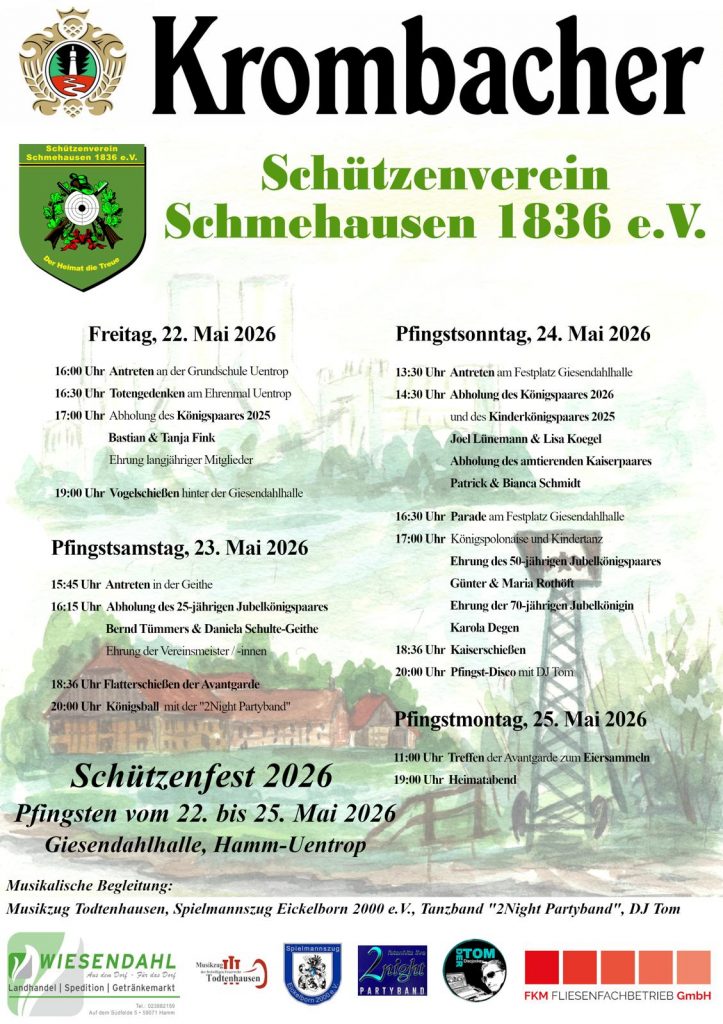 Im Schützenverein laufen bereits die Vorbereitungen auf das diesjährige Schützenfest, welches traditionell um das Pfingstwochenende (22.05. – 25.05.) ausgetragen wird. Neben dem Königsschießen am Freitag finden in diesem Jahr zusätzlich das Flatterschießen der Avantgarde (Samstag) sowie ein Kaiserschießen (Sonntag) statt. Die Gäste an der Giesendahlhalle werden somit an 3 aufeinanderfolgenden Tagen in den Genuss eines hoffentlich spannenden Vogelschießens kommen.
